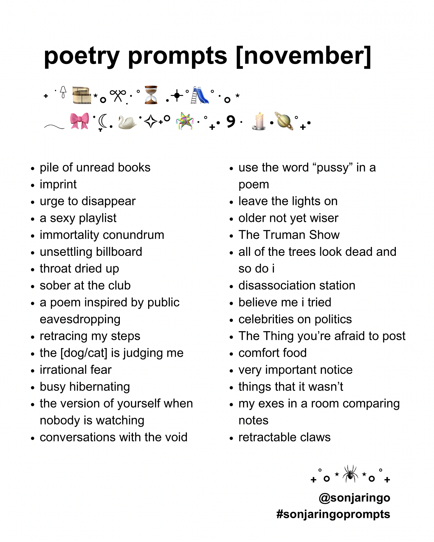 on the topic of prompts, i will also be sharing extra poetry prompts this month for my paid subscribers! this is something i have never done before, but i’m offering it as an extra treat for those of you who do subscribe to my publication as paid members. stay tuned for those in the coming days! 👀